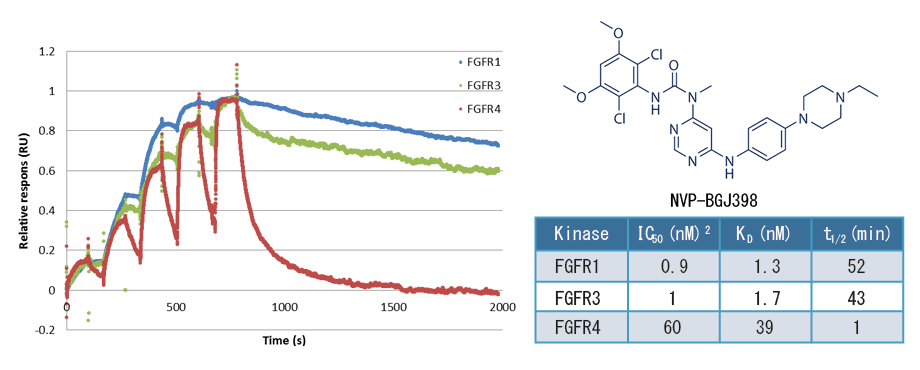 本サービスでの測定はn=2以上5濃度で行われ、化合物の結合速度定数(Ka)、解離速度定数(Kd)、解離定数(K