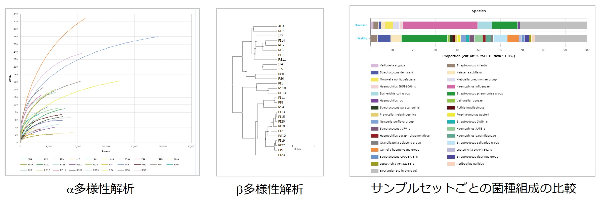 - α多様性(サンプルごとの菌種の多様性)およびβ多様性(サンプル間の菌種組成の類似性)解析