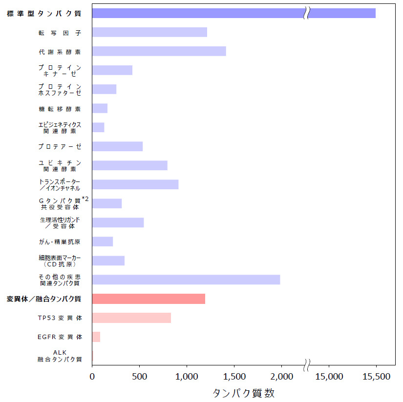 | ・(株)セルフリーサイエンス社のコムギ胚芽無細胞系で合成した16,000種類以上のヒトタンパク質 ・15,406遺伝子に対応 ・公共データベースに登録されている基準配列(NCBI RefSeq, UniProtKB/Swiss-Prot)に相当するタンパク質15,272種を含む ・がんを中心としたヒトの諸疾患に認められる変異体・融合タンパク質1,190種を含む ・タンパク質の機能分類に基づく主要なカテゴリーにおけるタンパク質数は(fig.1)の通り(*1) ・(fig.1)の標準型タンパク質主要カテゴリーの多くについて8割以上の遺伝子を網羅 ・25遺伝子に由来する変異体タンパク質と、12パターンのALK融合遺伝子に由来するタンパク質を含む ・TP53、EGFRの変異体を多数取り揃える |