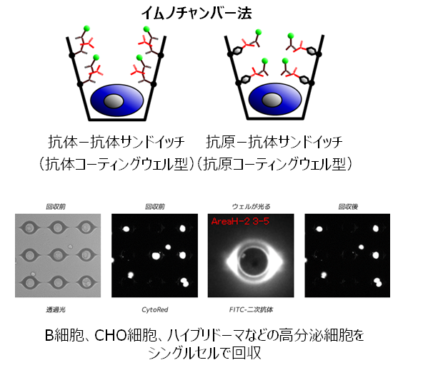 AS ONE Cell Picking System専用のイムノチャンバーを用いて、抗体分泌細胞(B細胞、CHO細胞、ハイブリドーマなど)で分泌能が最も高い細胞を1細胞単位で採取します。これにより、従来の限界希釈法では2ヶ月以上の期間を要していたクローン回収が、2週間に短縮されます。従来よりもより正確に、かつ迅速に抗体高分泌細胞を得ることができます。