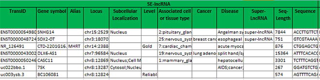 - transcript ID、gene symbolおよびalias、ゲノム遺伝子座、配列および長さ、細胞内局在、関連する細胞または組織の種類、がんおよび疾患、重複したスーパーエンハンサー情報