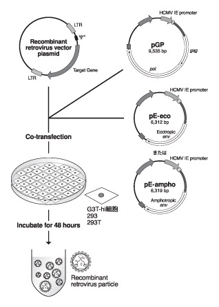 gag-pol発現プラスミド、env発現プラスミド、およびレトロウイルスベクタープラスミドを同時トランスフェクションすることによって、細胞内で発現したgag-polタンパク質、envタンパク質、および組換えレトロウイルスゲノムRNAがアセンブルして組換えレトロウイルス粒子が出芽します。エンベロープ遺伝子はマウス、ラットに感染可能なecotropic-env、あるいはヒトを含む多くの哺乳動物細胞に感染可能なamphotropic-envから選択していただきます。トランスフェクションから48時間後の培養上清をフィルターろ過してレトロウイルスベクター液とし、小分け分注して納品いたします。(fig.1)