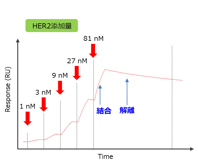 3. HER2タンパク質(アナライト)を段階的に添加し、各濃度における相互作用を連続検出