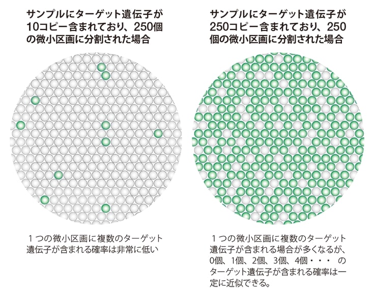 デジタルPCRではサンプルの単位容量あたりにターゲット遺伝子が何コピー 存在するかを算出しますが、限界希釈であっても微小区画あたりの断片数 が1以上になる場合があります。 これを補正するため、ポジティブの数と微小区画の数をポアソン分布にあてはめて最終濃度を算出します。この補正は微小区画数が多いほど精度が高くなり、ばらつきをおさえるには1サンプルあたり10,000区画以上が必要とされています。