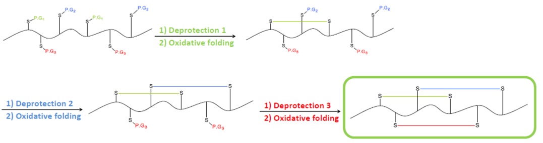 - ペプチドの固相合成時に保護基を導入したシステインを用い、システイン残基が保護されたペプチドを合成する。この時にジスルフィド結合を導入したいシステイン残基のペアごとに異なった複数種の保護基を用いる。