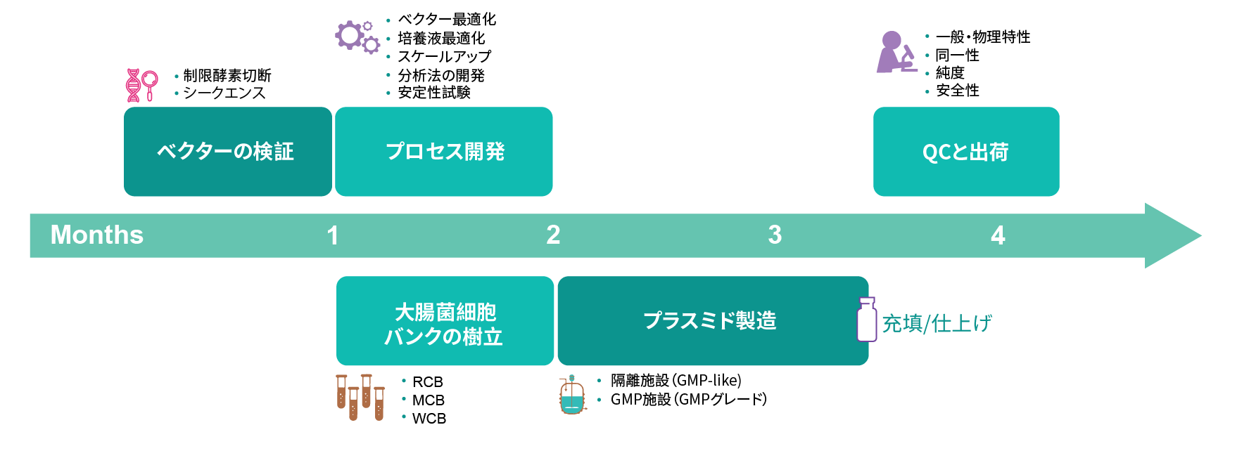 VectorBuilderは、品質の良い製品を納期通りにお届けすることに努めています。プラスミドDNAの典型的なGMP製造ワークフローを示します(