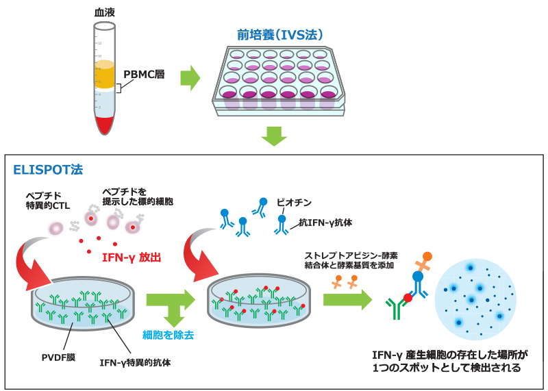 | 前培養(IVS) | ELISPOT解析の前に、PBMCをペプチドおよびサイトカインで刺激を加えながら2週間培養します(in vitro sensitization;IVS)。ペプチド特異的CTLを活性化し増殖させることができ、存在頻度の低いCTLによる免疫応答を検出する場合に推奨しています。 |