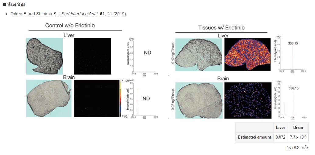 マウスへ投与したエルロチニブの肝臓と脳内における質量分析イメージングの結果(