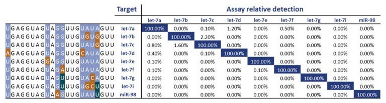 fig.1)のlet-7 miRNAファミリーを用いた特異性の検討例では、各アイソフォームは1塩基程度の差しかない高い相同性を有するにもかかわらず、明確に識別することができました。