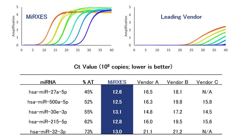 また通常は増幅が難しいとされるAT含有率の高いmiRNAであっても、既存製品に比べてばらつきが抑えられ、安定して検出できます。(