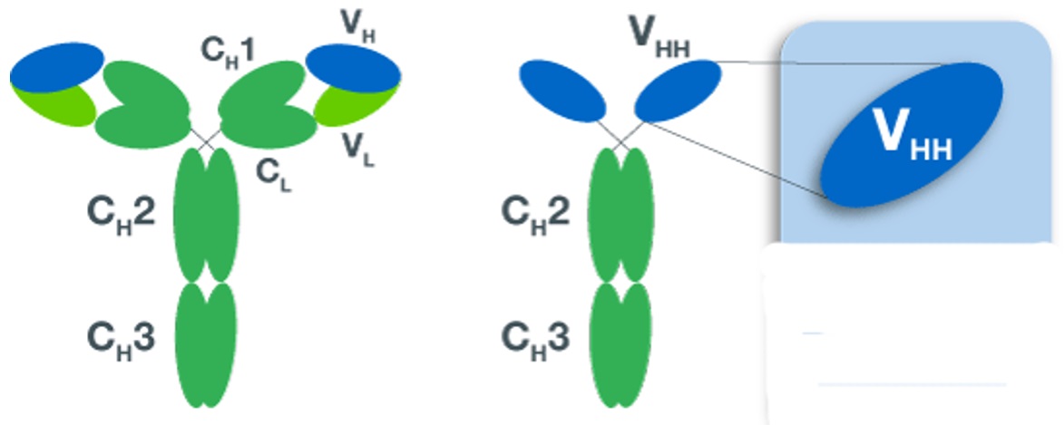 ウサギやマウスなどの一般的なIgG抗体は軽鎖と重鎖の2種類の組み合わせで構成されるのに対して、ラマ・アルパカなどラクダ科の動物は重鎖のみから構成されるIgG抗体を有しています。