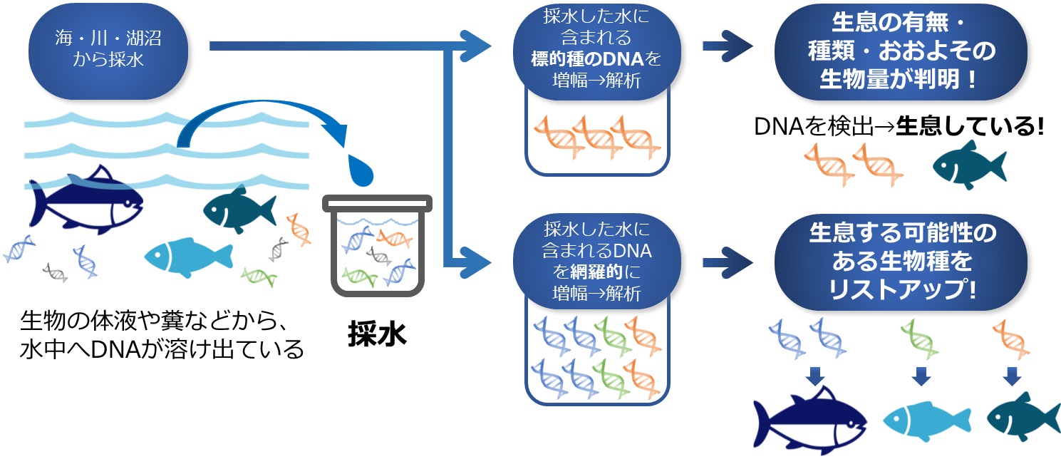 環境DNAを解析することで、そこに生息する生物の種類やおおよその生物量の把握が可能です。