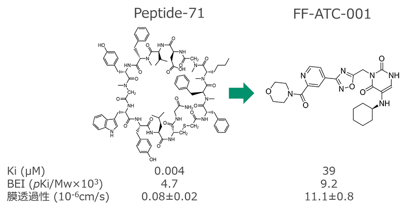 PDL1阻害剤Peptide-71の 結合配座および結合部位 *を基点に、新規構造を設計し、低分子化合物FF-ATC-001を取得 (設計時間は約1ヶ月)