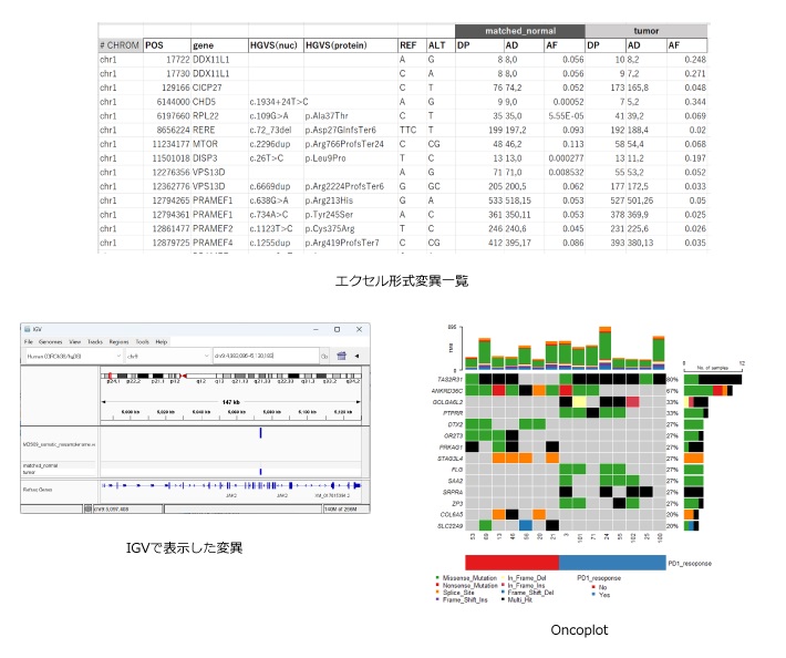 がんと正常サンプルのシーケンスデータを比較することで体細胞変異を検出し、バイオマーカーの候補を検討することができます。