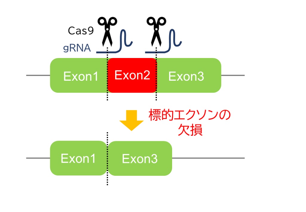 2種類のガイドRNAを同時に用いて、標的エクソンの上流と下流で切断し、標的遺伝子の特定のエクソンを丸ごと欠失させた遺伝子改変マウス(エクソン欠損マウス)を作製します。特定のエクソンごとの機能解析が可能です。