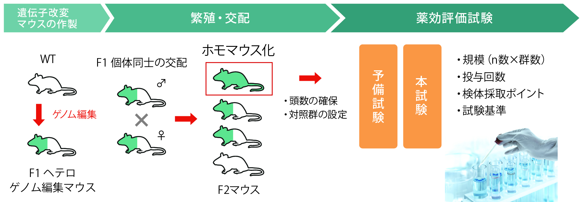 ヘテロ×ヘテロ交配によるホモ化や、Creマウスとの交配によるconditional KO(floxホモ・Creヘテロ)マウスの作出、対照群を含めた必要匹数を確保するための大量繁殖・飼育など、セツロテックにお任せください。研究にぴったりの欲しいゲノム編集マウスが、きっちり頭数揃えて、手間いらずでお手元に届きます!(