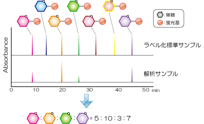 単糖を蛍光基でラベル化し、標準品と比較することでサンプル中の各糖の組成、定量を可能とします。(fig.1)