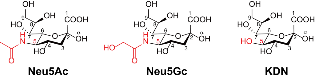 5位アミノ基が、アセチル修飾されたN-アセチルノイラミン酸 (Neu5Ac)、グリコリル修飾された N-グリコリルノイラミン酸 (Neu5Gc)、水酸基に置換されたデアミノノイラミン酸(3-deoxy-D–glycero–D-galacto-2-nonulopyranosonic acid; KDN)を標準品として使用いたします。(