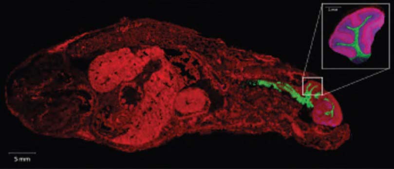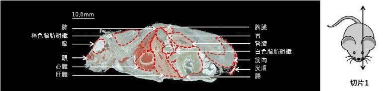 コア針生検からげっ歯類の全身までサンプルを切片化することが可能です。関心領域を視覚化するために、選択された断面図でクライオスタットを使用して切片化されます。分子分析および形態学的研究のために、5~12μm の切片がスライドガラス上に堆積されます。マウスの全身を対象とする場合、肺、脳、心臓、目、肺、肝臓、胃、腎臓、脾臓、腸などのほとんどの臓器がサンプル内に存在するため、左目側の断面図を選択するのが一般的です。