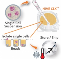 HIVE CLXTM Single-cell RNAseq Solutionはピコウェル型の独自デバイスHIVETM sample collectorとライブラリー試薬を用いたSingle cell RNA Sequencingのプラットフォームです。マイクロ流路型のような特別な機器は使用せず、重力/遠心によって細胞をHIVETM sample collectorのピコウェルに穏やかに捕捉し、凍結保存が可能です。そのため、顆粒球などの脆弱な細胞も効率よく解析することができます。