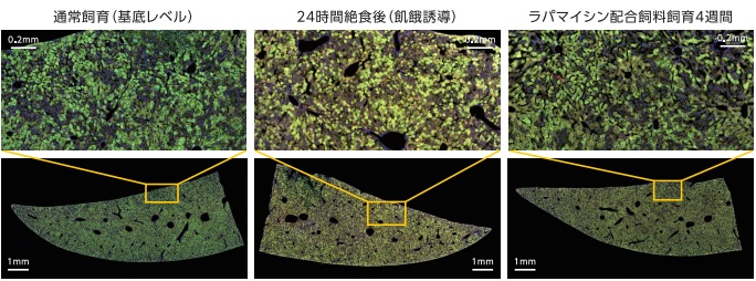 GLRマウスは、マウス体内で緑色蛍光タンパク質GFPと赤色蛍光タンパク質RFPの2種類の蛍光タンパク質をつなげたオートファジーマー力ー(LC3) が発現する遺伝子組み換えマウスです。24時間絶食後やラパマイシン配合飼料で4週間飼育したGLRマウスの肝臓組織では、オートファジーの活性化に伴いGFPの緑色蛍光が弱くなりRFPの赤色蛍光が強くなります(