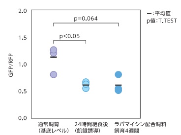 fig.1) 。本試験では 、GLRマウスの肝臓組織ライセートの蛍光測定によりGFP / RFP比を調べることでオートファジー活性レベルを評価します。基底レベルに比較してGFP / RFP値が低い結果はオートファジーが活性化していることを示します(