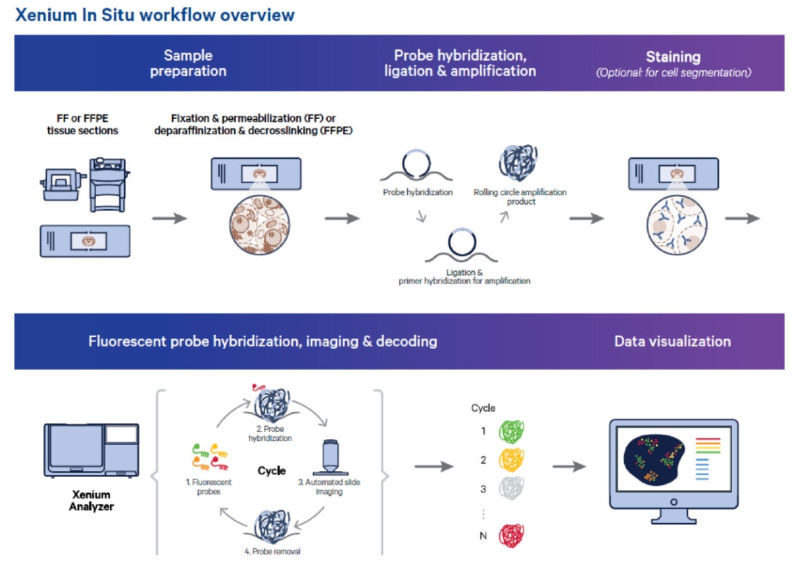 顕微鏡レベルで細胞の位置情報を持った遺伝子発現解析としてXenium in situ5K 解析、組織の位置情報を持ったNGS解析としてVisium HD解析を提供
