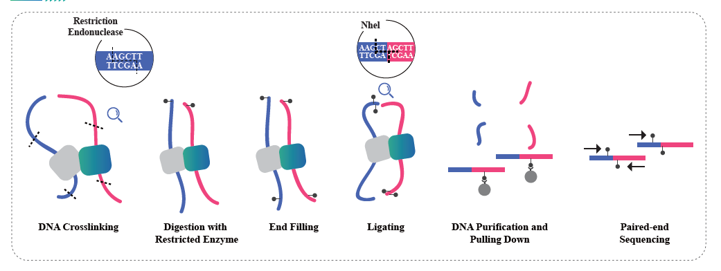 • Hi-C実験では、制限酵素による切断、そして付着末端の修復が行われ、その際にビオチンが付加されます。その後、相互作用を保持したまま、得られた平滑末端を環状化します。続いてDNAはストレプトアビジンビーズでプルダウンされ、その後のライブラリー調製のために精製されます。