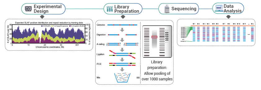 ハイスループットなジェノタイピング、特に大規模集団におけるジェノタイピング解析は、遺伝的関連研究の基本ステップであり、機能的遺伝子探索や進化解析などのための遺伝的基盤を提供します。この様な研究では、全ゲノムのディープリシークエンスの代わりに、Reduced Representation Genome Sequencing(RRGS)が採用されることが多く、遺伝子マーカー探索において妥当な効率を維持しながらサンプルあたりのシークエンシングコストを最小限に抑えることができます。RRGSは、DNAを制限酵素で消化し、特定の断片サイズ範囲に焦点を当てることで、ゲノムの一部のみをシークエンシングすることでこれを実現します。様々なRRGS手法の中でも、特定遺伝子座増幅断片シークエンス(Specific-Locus Amplified Fragment Sequencing: SLAF-Seq)はカスタマイズ可能で高品質なアプローチです。BMKGene が独自に開発したこの方法は、プロジェクト毎に制限酵素セットを最適化します。これにより、反復領域を効果的に回避しながらゲノム全体に均一に分布する相当数のSLAFタグ(配列決定対象のゲノムの400~500 bps領域)が生成され、最適な遺伝子マーカーの発見が保証されます。
