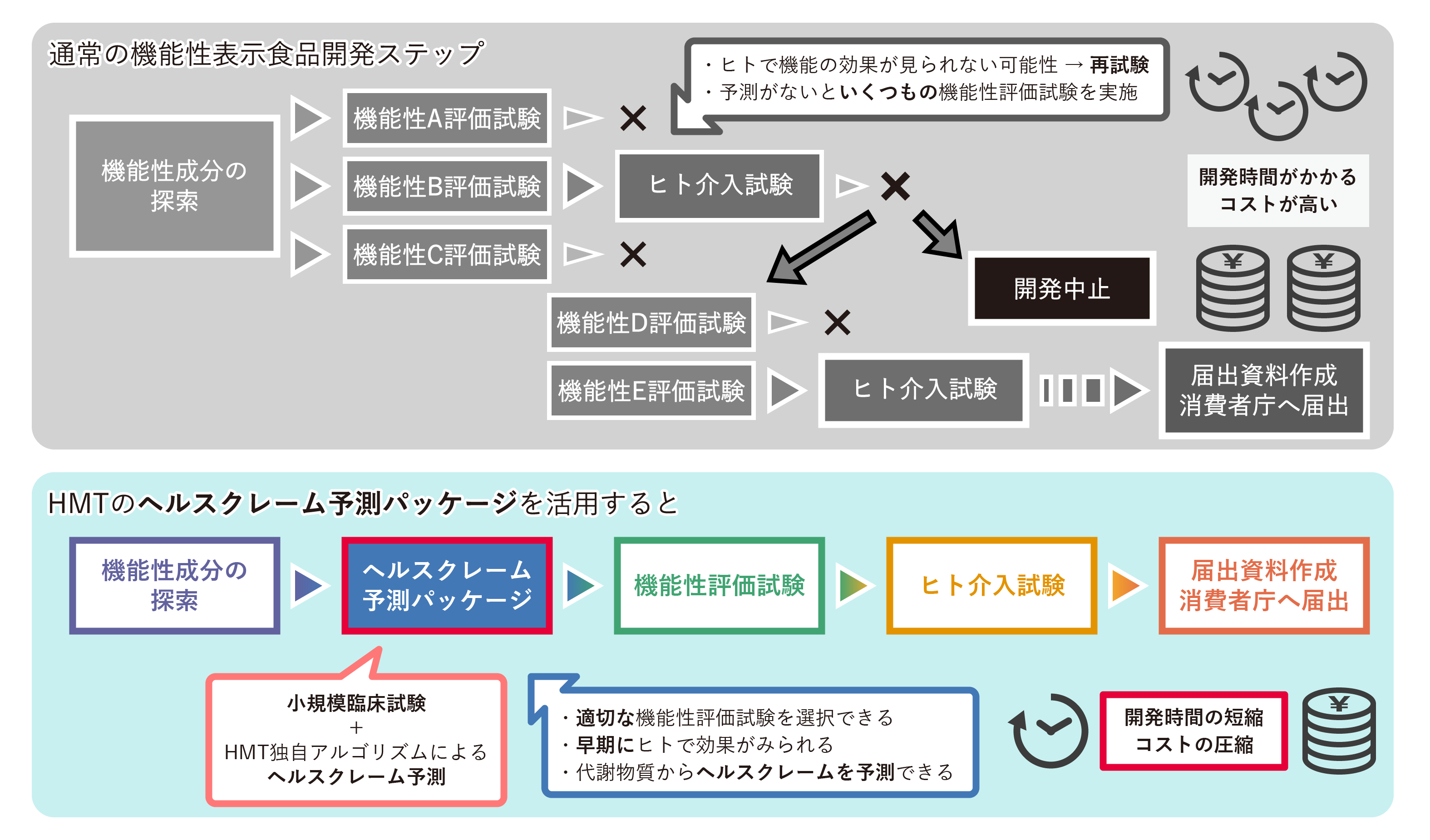 HMTの「ヘルスクレーム予測パッケージ」では、小規模でのヒト試験「目利き臨床試験」を行うとともに、食品摂取前後で被験者から採取した血液等の検体の代謝物質変動情報をHMT独自のアルゴリズムを用いて解析することで、素材のもつ機能性や摂取効果を推定することができるため、従来法と比較して効率的にヘルスクレームを予測することができます。(