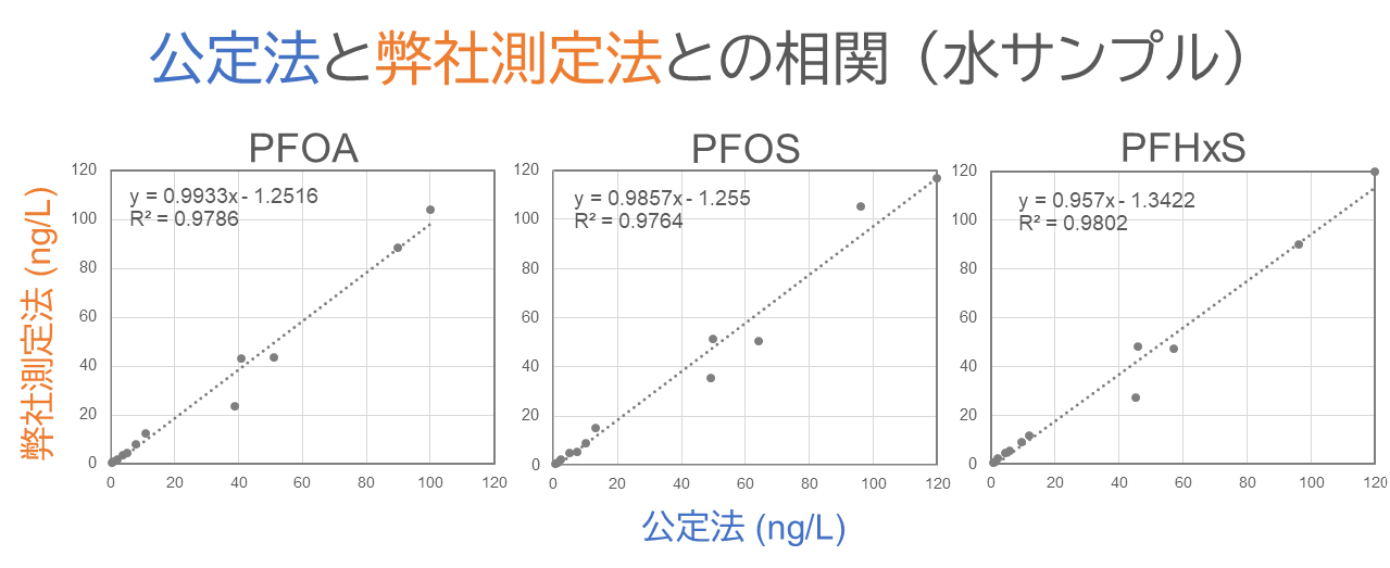 この度、PFAS の中でも生体内で毒性を示すことが示唆されているPFOA、PFOS、PFHxSを対象としたLC-MS/MSによる受託分析サービスを始めました。PFAS測定では、環境中や実験器具等からの混入(コンタミ)が大きな問題となりますが、弊社では前処理法等を工夫しコンタミの影響を抑えることに成功しました。そのため、必要サンプル量は水で15mLと他社と比較し少量で測定すること可能です。また、本測定法で得られる値は公定法と高い相関を示します(