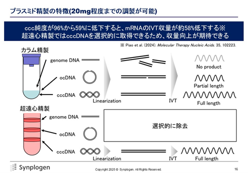IVT用のテンプレートとしてプラスミドが使われておりますが、cccプラスミド純度がIVT後のmRNA収量やdsRNAの生成に影響を与えると言われております(Piao et al. (2024)