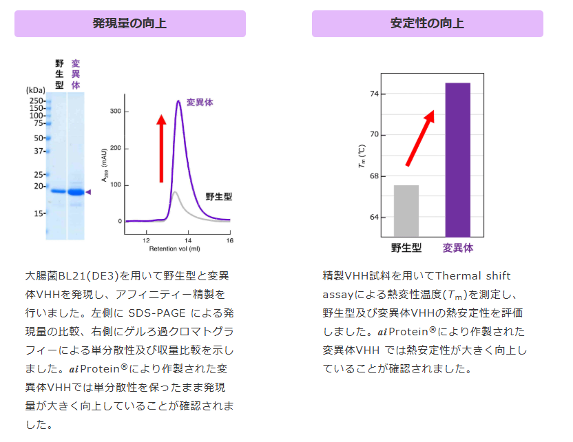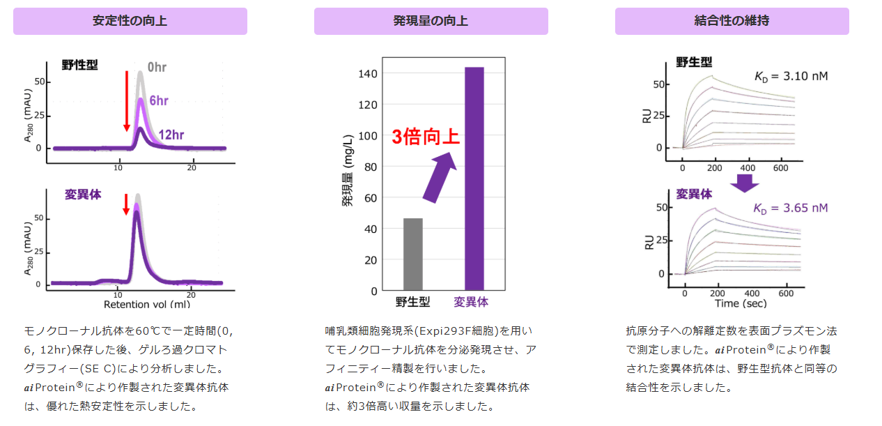 ® を利用し、抗原結合性への影響を最小限に、抗体の発現量・安定性などの複数の特性値をバランスよく同時に向上させるサービスです。aiProtein