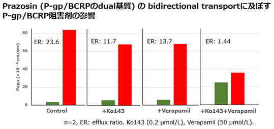 fig.4 評価例:Prazosin(P-gp/BCRPのdual基質)のbidirectional transportに及ぼすP-gp/BCRP阻害剤の影響
