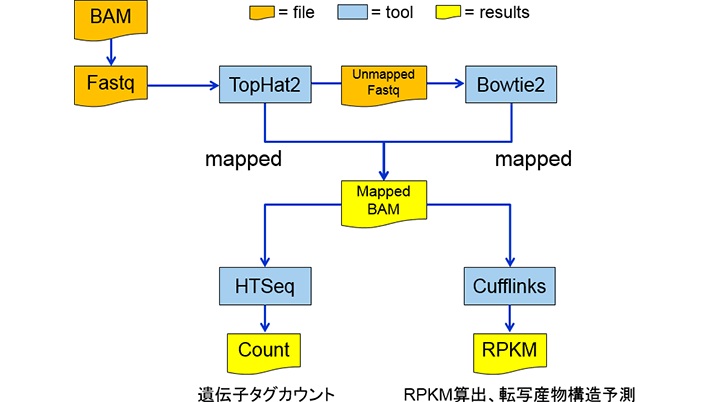 | 主な使用ソフトウェア | TopHat2, Bowtie2, HTSeq, Cufflinks |