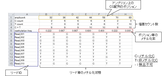 | 機能 | ・バイサルファイト処理DNAを考慮したマッピング ・アンプリコン内の各CpGポジション毎のメチル化率を算出 ・リード毎のメチル化状態を解析して出力 |