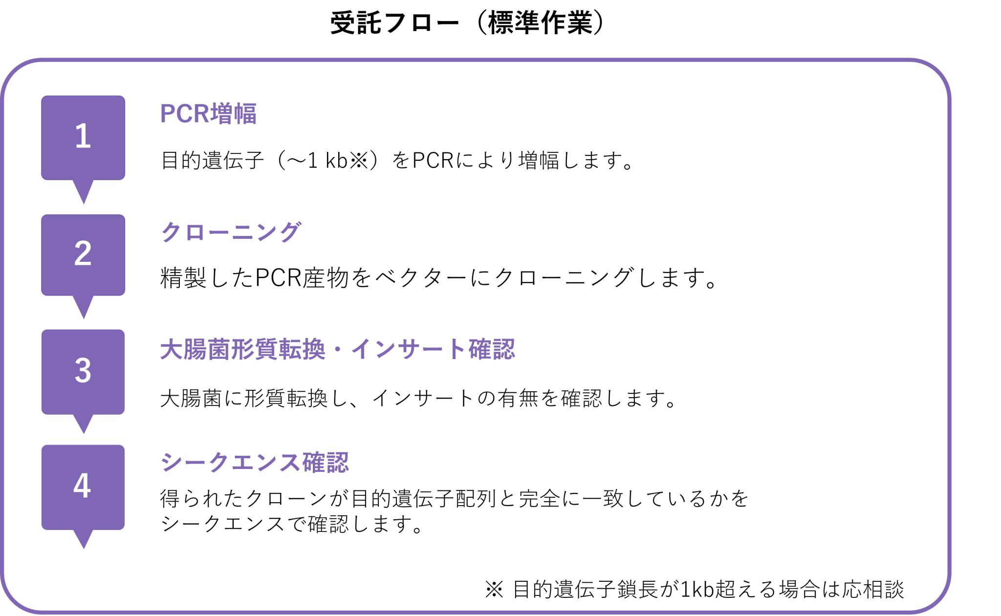 標準では、PCR増幅用テンプレートおよびクローニングベクターをご提供いただくだけで、クローン作製を行います。