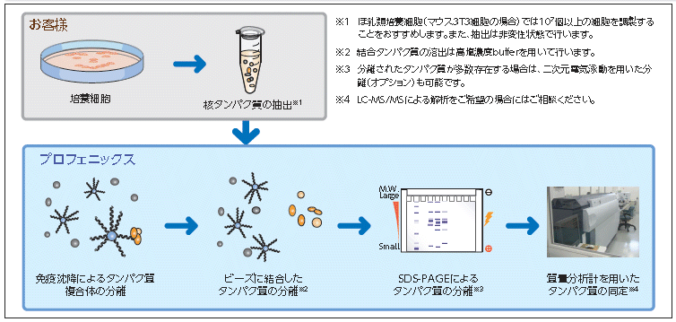細胞から核タンパク質を非変性条件下で抽出し、さらにこの中からDNAに親和性のあるタンパク質をDNA結合ビーズにより分離し、DNA結合タンパク質を質量分析計によって同定するサービスです。細胞内タンパク質の分画とDNA親和性に基づく濃縮の両方を行うため、低発現量タンパク質の解析にもご利用できます。