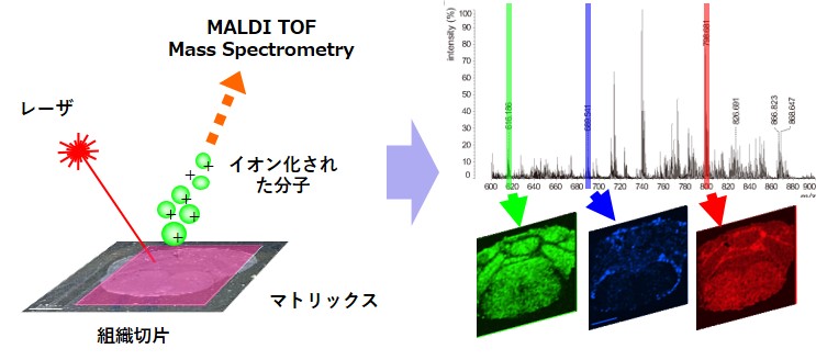 近年MALDI法による質量分析を用いて生体組織切片から直接、対象とする生体分子 (低分子代謝産物,脂質,ペプチドやタンパク質など)を解析する方法が注目を集めており、 疾病部位におけるバイオマーカー探索への応用が期待されています。
