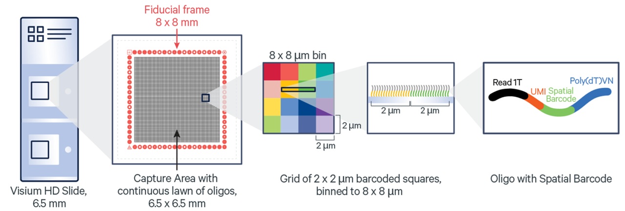 Visium HD専用スライドには、6.5 × 6.5mmのキャプチャーエリアが2領域搭載されており、それぞれの領域には約1,100万個の2 × 2µmサイズの正方形グリッドが敷き詰められています。各グリッドには固有のバーコードを持つオリゴヌクレオチドが配置されており、これにより単一細胞レベルに迫る空間分解能での遺伝子発現解析が可能になります。(