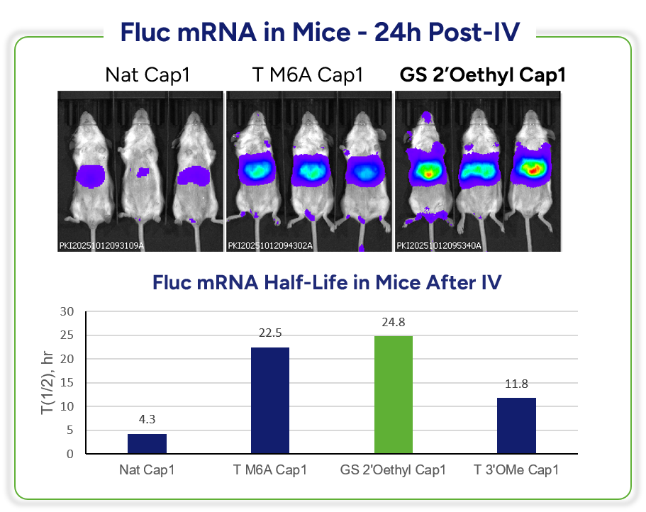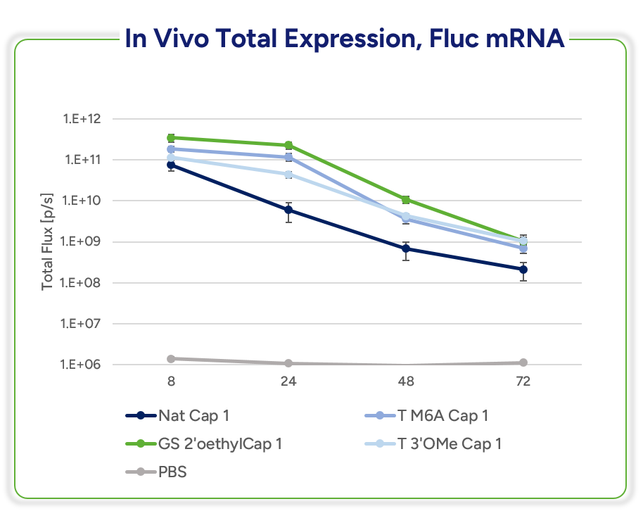 新規2’-O-Ethyl-capped RNAは、天然のCap1 RNAよりも高い発現を示し、生体内でのクリアランス速度が遅いことが確認されました。(fig.2)(fig.3
