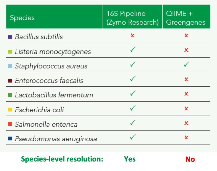ZymoResearch社 16Sシークエンシングサービスおよび既存法(QIIMEソフトウェアとGreengenesデータベースの組み合わせ)による種レベルでの同定可否(