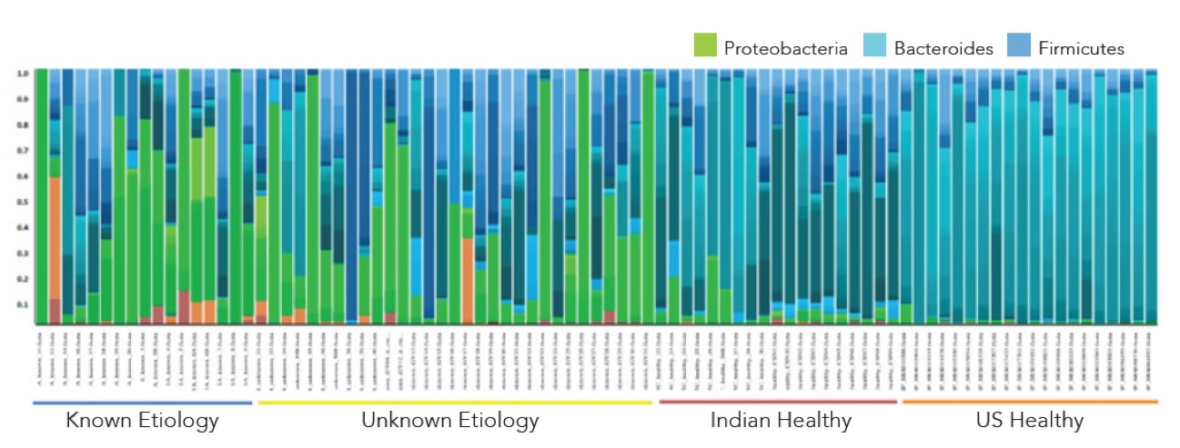 - 図の各点は、全体の微生物組成プロファイル。類似の微生物組成プロファイルを有する試料は互いに近く位置する。