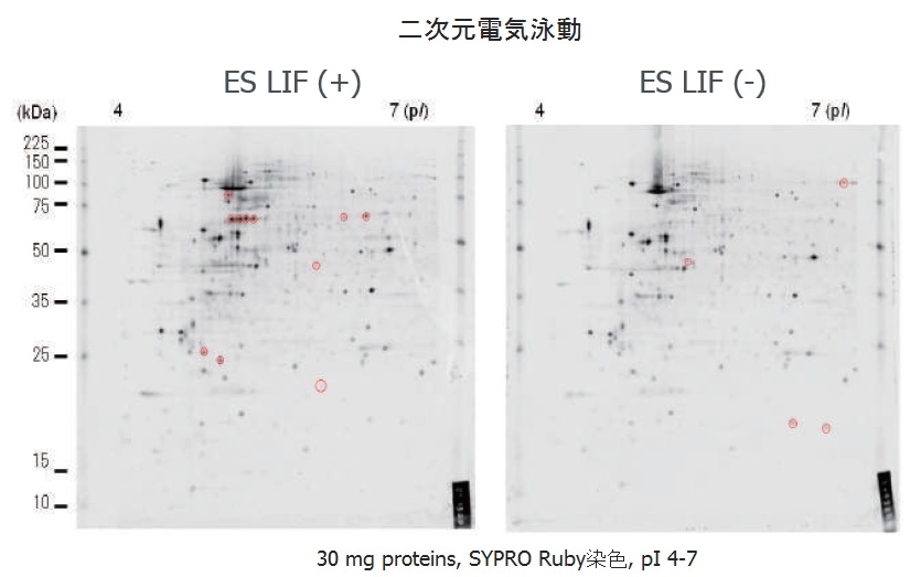 マウスES細胞は増殖因子の一種であるLeukemia inhibitory factor (LIF)の添加によって、多能性を維持した状態で培養が可能です。 この機構にはJAK-STAT3シグナル伝達系の活性化が重要であることがわかっていますが、それ以外のシグナル系も重要であると考えられています。そこで、LIFを添加することでES細胞内のリン酸化タンパク質がどの様に変動するか、リン酸化タンパク質に親和性のあるカラムと二次元電気泳動・質量分析計を用いて、網羅的に解析しました。