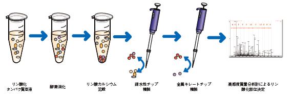 リン酸基の結合したペプチドを質量分析計で観測できることは少なく、通常の方法でリン酸基結合部位の同定を行うことは困難です。前処理を行うことで、リン酸基結合ペプチドを観測しやすくし、リン酸化部位の同定を行います。(