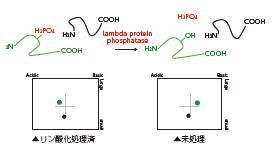 脱リン酸化酵素によってリン酸化タンパク質からリン酸基を除去すると、タンパク質の等電点に変化が起きます。この現象を利用して、等電点方向のスポットの変化が起こったものに注目してリン酸化タンパク質の網羅的解析を行います。