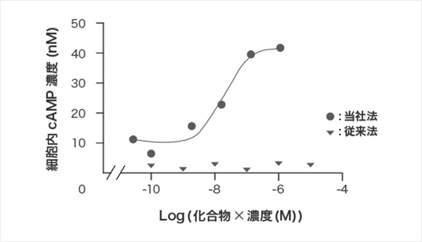 本法または従来法でB受容体安定発現細胞を作製し、化合物によって誘導されるcAMP濃度の変化について比較した。従来法と比べ、本法で作製した細胞は化合物添加濃度の上昇に伴ってcAMP濃度が上昇した。(