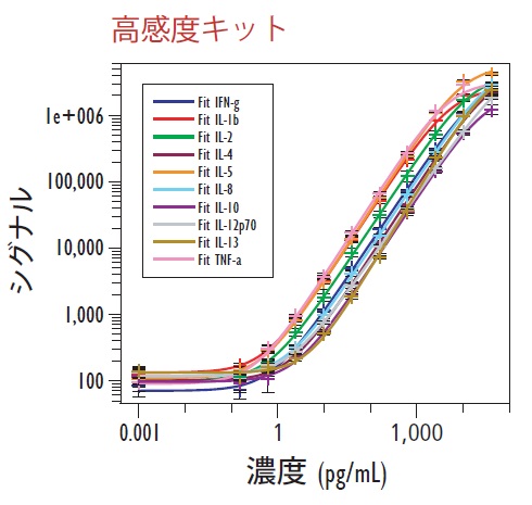 | V-PLEX Proinflammatory Panel 1 Human Kit | Human | 10 | ・IL-1β ・IL-2 ・IL-4 ・IL-6 ・IL-8 ・IL-10 ・IL-12p70 ・IL-13 ・TNF-α ・IFN-γ | ¥1,100,000 |