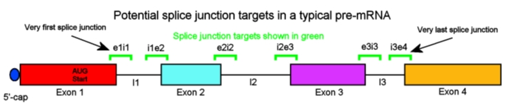 モルフォリノオリゴは、スプライスジャンクションまたはスプライス調節タンパク質の結合部位のいずれかを標的としてスプライシングを改変します。スプライスジャンクションを標的とする場合、25塩基のモルフォリノオリゴは、エクソン配列由来の0~10塩基と、イントロン配列の末端部分を標的とします。最初、または最後のスプライスジャンクションを標的にすると、通常、隣接するイントロンが挿入されます。(fig.7)