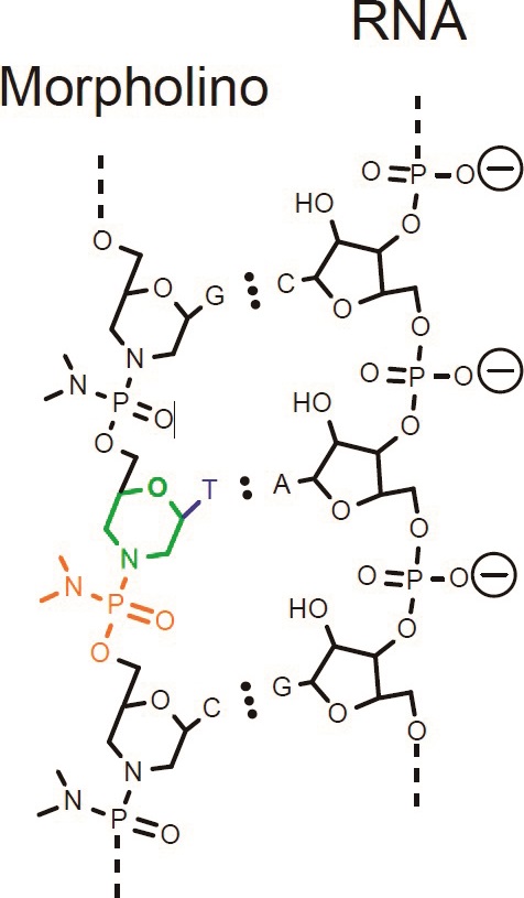 このモルフォリノオリゴをアンチセンスに用いたものが、モルフォリノアンチセンスオリゴ(Morpholino Antisense Oligo)となります。